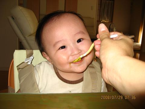 先週、買った、里帰り用のお食事椅子にてお食事中。